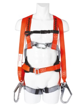 Full body harness with support back belt. Adjustable waist. Two side waist working D-rings. One D-ring on the back. Attachment point for hook of shock and energy absorber double lanyard with two scaffolding hooks. Vertical anchorage systems as well as for rescue operations.